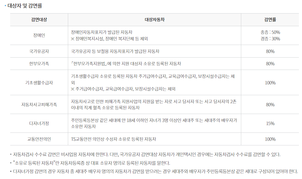 한국교통안전공단 자동차검사소에서는 사회공헌활동의 일환으로, 사회적약자를 대상으로 정기검사 및 종합검사시 정상수수료의 일정비율을 감면해드립니다. 접수직원에게 감면대상자임을 말씀해주시게되면, 전산조회를 통해 확인이 가능합니다. 전산확인이 불가능할 경우(전산미등록, 누락 등) 정상수수료가 부과되며, 수검 후 60일 전산조회가 가능한 경우(요청시점 기준) 감면액을 환불해드립니다.